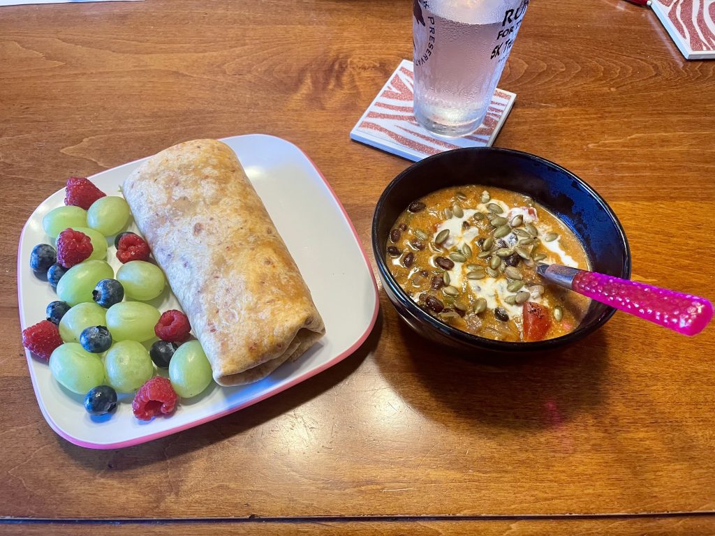 The Best Black Bean Pumpkin Soup (on the right) and a Spring Mix, Avocado, Stone Ground Mustard filled Sun Dried Tomato wrap (left) alongside some fruit for dessert. It was yummy!